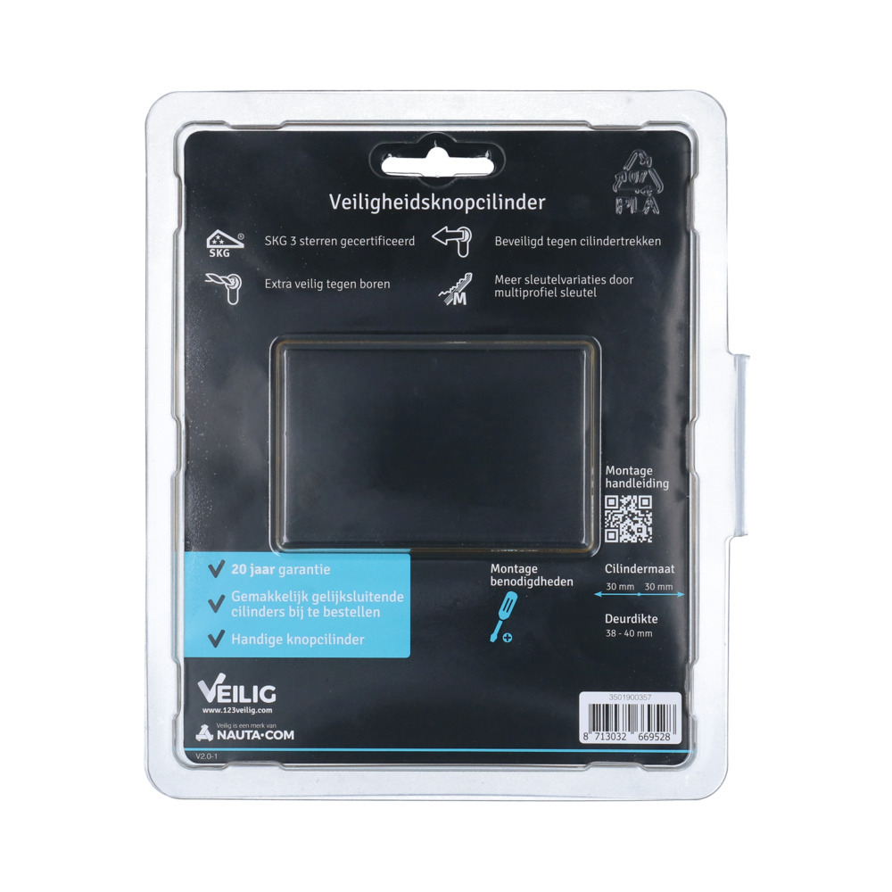 VEILIG veiligheidsknopcilinder, lengte K30/30, profiel S7, zwart, verschillend sluitend, 3 sleutels, skg***, in blister