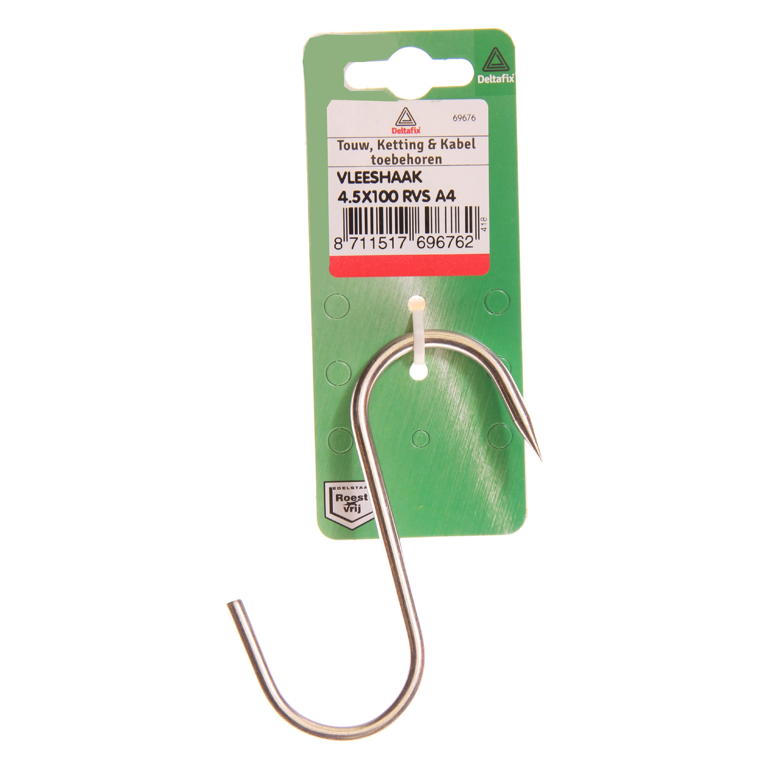 Roestvaststalen vleeshaak met een bot en een scherp uiteinde. Vleeshaken worden bijvoorbeeld gebruikt in slagerijen om vlees op te hangen.
