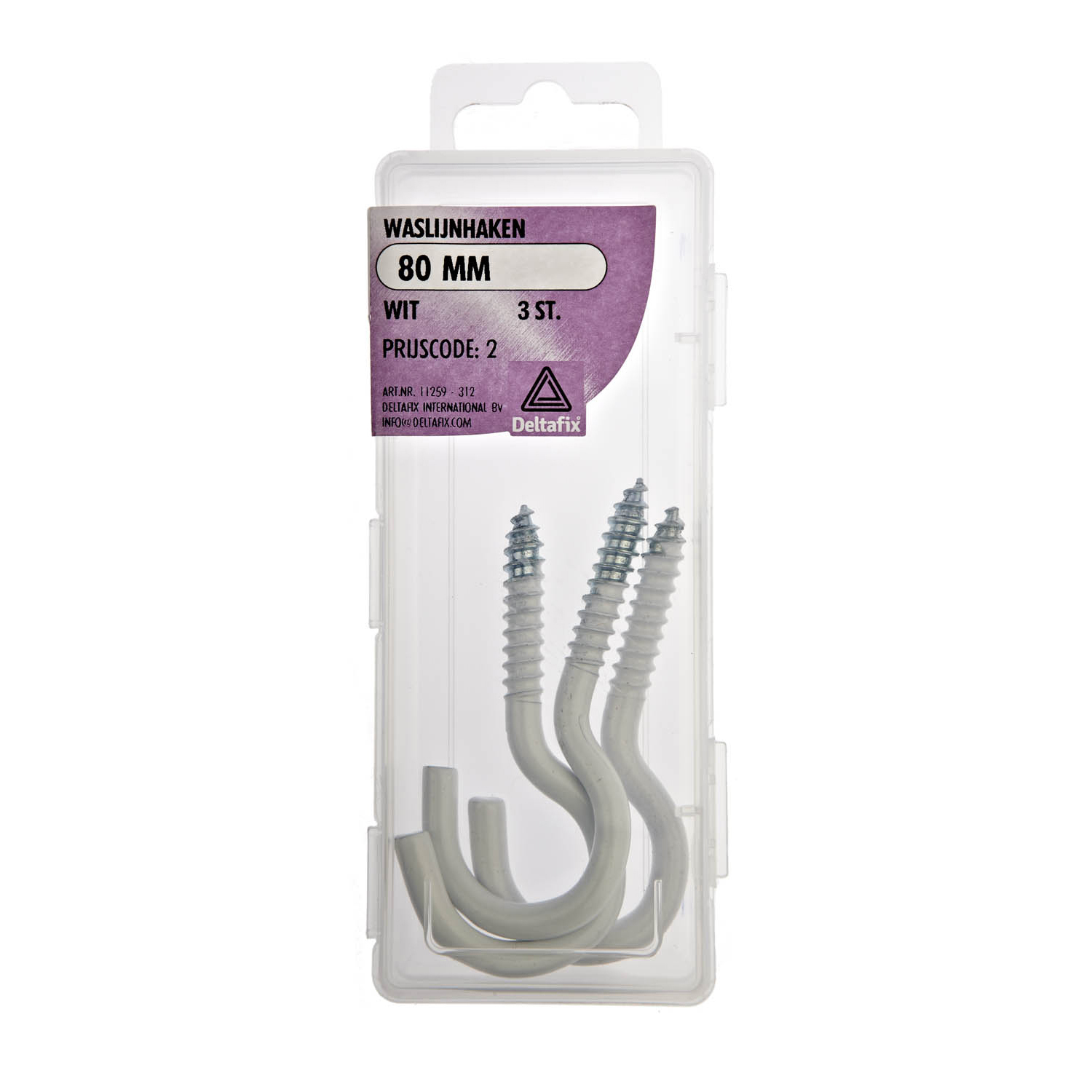 Witte waslijnhaak met open oog voor bevestiging in hout of steen, beton in combinatie met een plug. Deze haak heeft een grotere diameter dan een schroefhaak. Handig voor bijvoorbeeld het ophangen van een waslijn.
