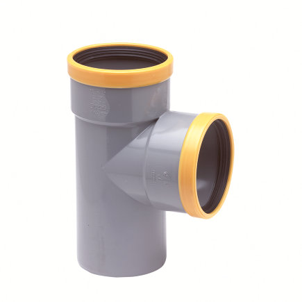 Dit 88° T-stuk is uitgevoerd in 2x manchet / 1x spie en wordt gebruikt voor buitenriolering.