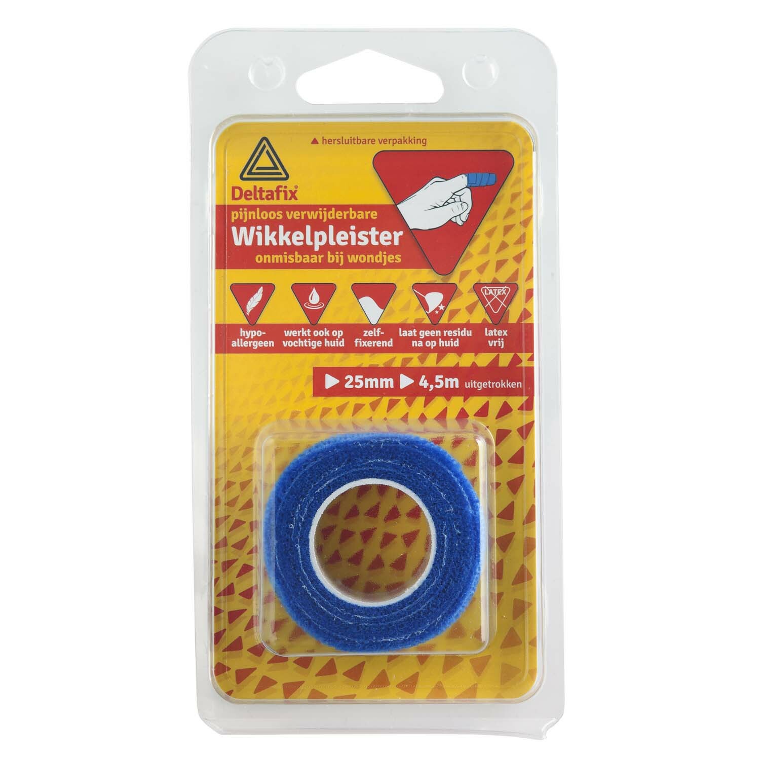Nooit meer een schaar zoeken, nooit meer een pleister die niet goed zit of loslaat. Deze unieke wikkelpleister is overal en altijd te gebruiken. De pleister is bloedstelpend bij toepassing als drukverband en volledig zelffixerend zonder lijm. Het unieke materiaal zorgt altijd voor een goede hechting en de juiste druk. De pleister plakt niet op de huid of de wond. Bovendien is de wikkelpleister luchtdoorlatend, waterafstotend, elastisch en scheurbaar met de hand. Een schaar is dus niet meer nodig. Wel zo handig en snel bij een verwonding!Toepassingsvoorbeelden:- wondjes aan de vinger- wondjes op het gewricht- stabiel maken van gewrichten- kneuzingen bij sportblessures zoals verstuikingenKenmerken:afscheurbaar, waterbestendig, luchtdoorlatend, zelffixerend, hypoallergeen, dermatologisch getest, latexvrij, werkt ook op vochtige huid, glijdt niet af, laat na verwijdering geen plakmiddel achter op de huid.Let op: Elastisch materiaal niet te strak omwikkelen. Lees voor gebruik de bijsluiter aan de binnenzijde van de verpakking aandachtig door.