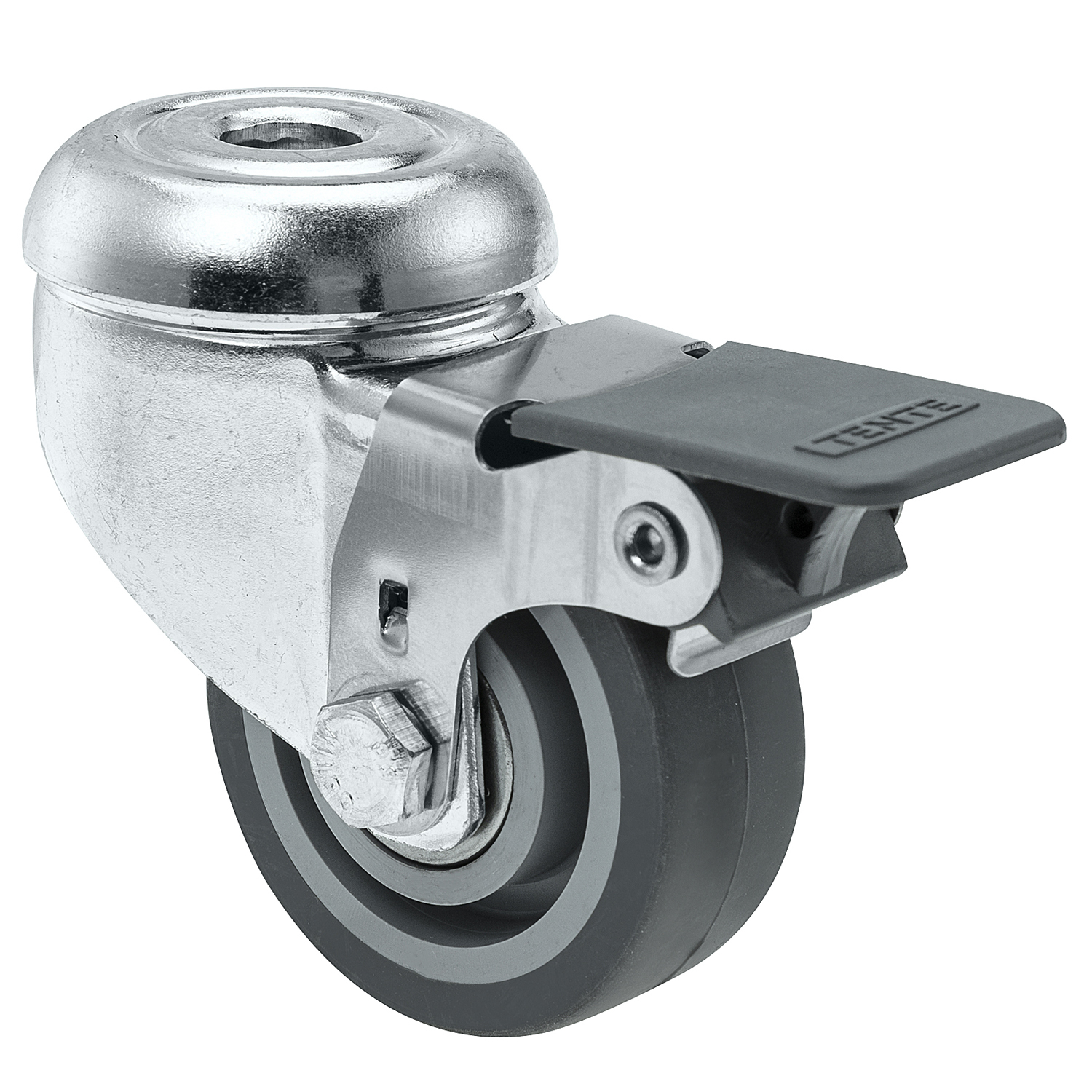 Zwenkwiel met enkele wielrem, vork van geperst staal, verzinkt, dubbele kogeldraaikrans in de zwenkkop, wielas geklonken, boutgat. Wielkern van polypropyleen met grijze niet-strepende TENTE prene thermoplastische rubberband, wielnaaf op kogellager. Deze wielen kunnen met elke in de handel verkrijgbare boutlengte gemonteerd worden.