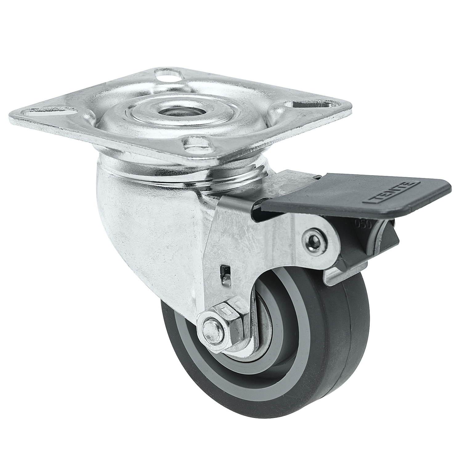 Zwenkwiel met enkele rem, vork van geperst staal, verzinkt, dubbele kogeldraaikrans in de zwenkkop, wielas geklonken, plaatbevestiging. Wielkern van polypropyleen met grijze niet-strepende TENTE prene thermoplastische rubberband, wielnaaf op kogellager