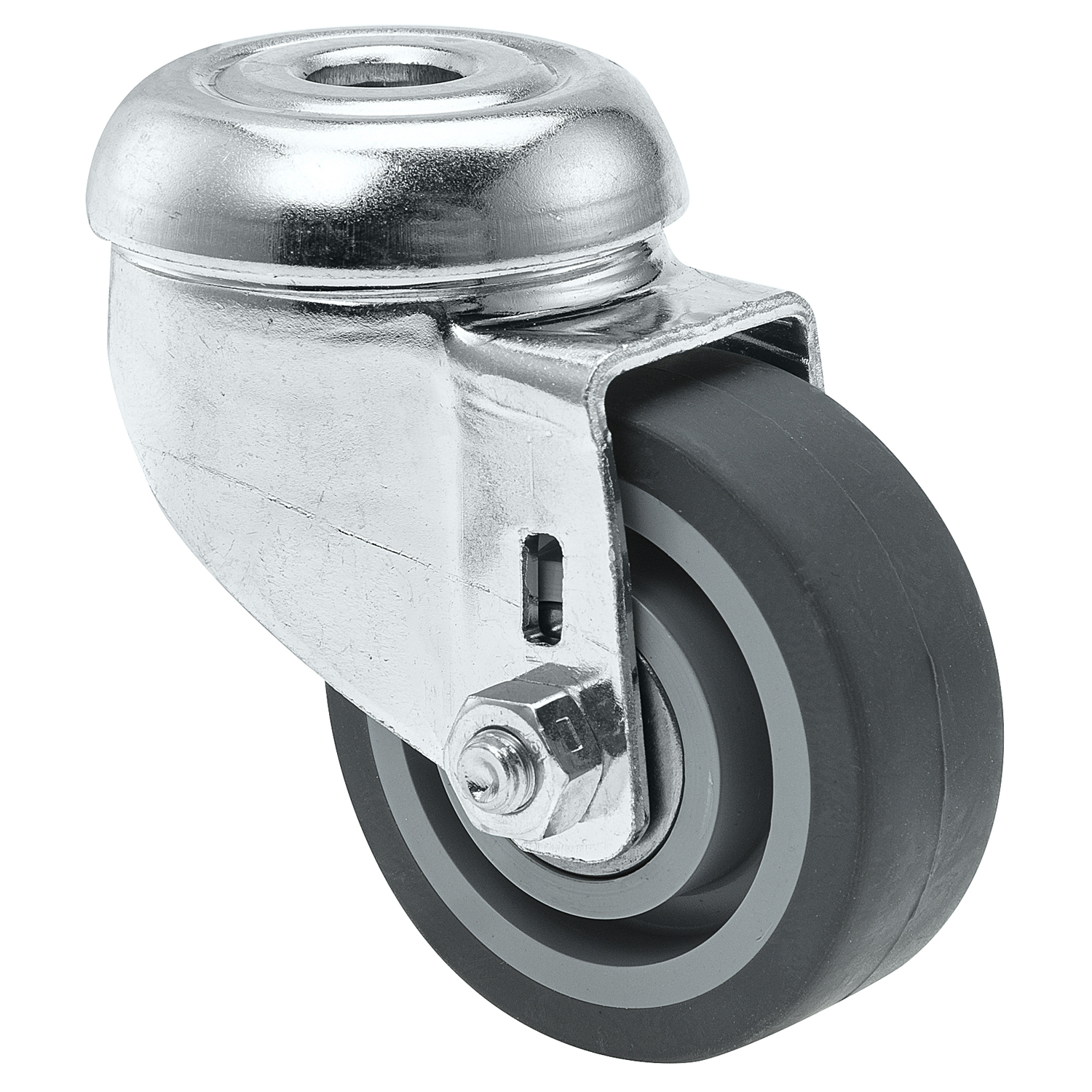 ZWENKWIEL, VORK VAN GEPERST STAAL, VERZINKT, DUBBELE KOGELDRAAIKRANS IN DE ZWENKKOP, BOUTGAT. WIELKERN VAN POLYPROPYLEEN MET GRIJZE NIETSTREPENDE TENTEPRENE THERMOPLASTISCHE RUBBERBAND, WIELNAAF OP PRECISIEKOGELLAGER, MET AFDEKKAPPEN , , DEZE WIE