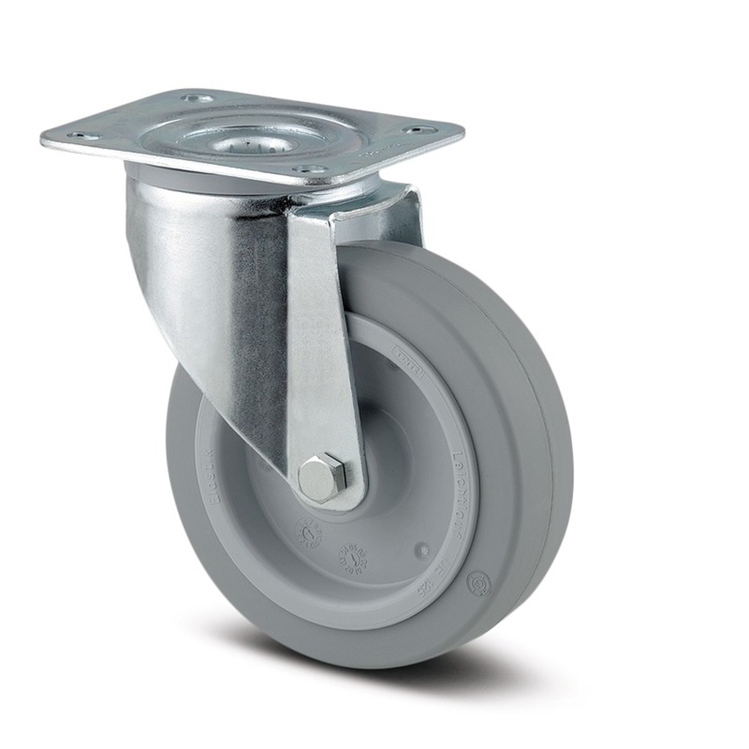 Zwenkwiel, vork van geperst staal, verzinkt, dubbele kogeldraaikrans in de zwenkkop, wielas geschroefd, stofafdichting, plaatbevestiging. Wielkern van polyamide met niet-strepende, elastische rubberband, wielnaaf op rollager